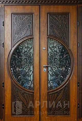 Двустворчатая дверь со стеклом и кованной решеткой №2